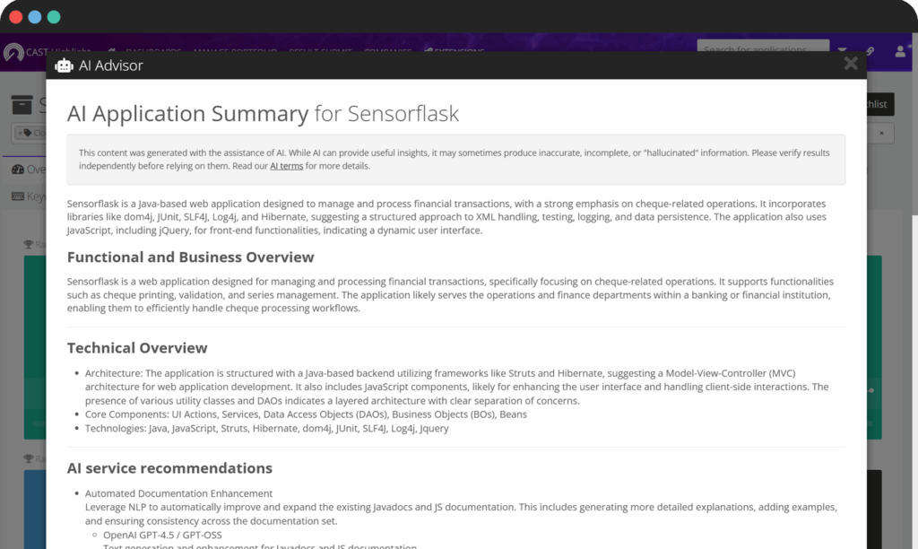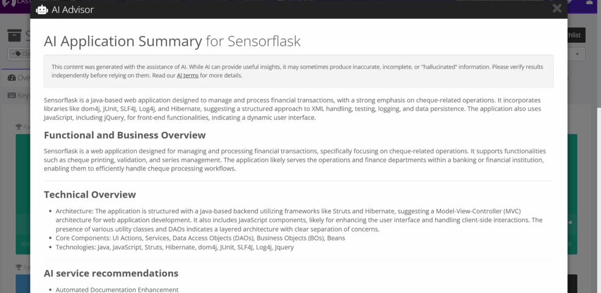 Get personalized explanations by clicking the robot icon next to any application name or the “Brief Me” button on the application overview screen. Briefings include a functional & business overview, technical overview, AI service recommendations, and suggested next steps.